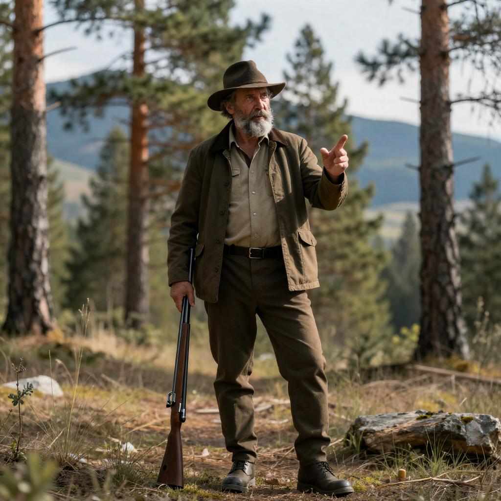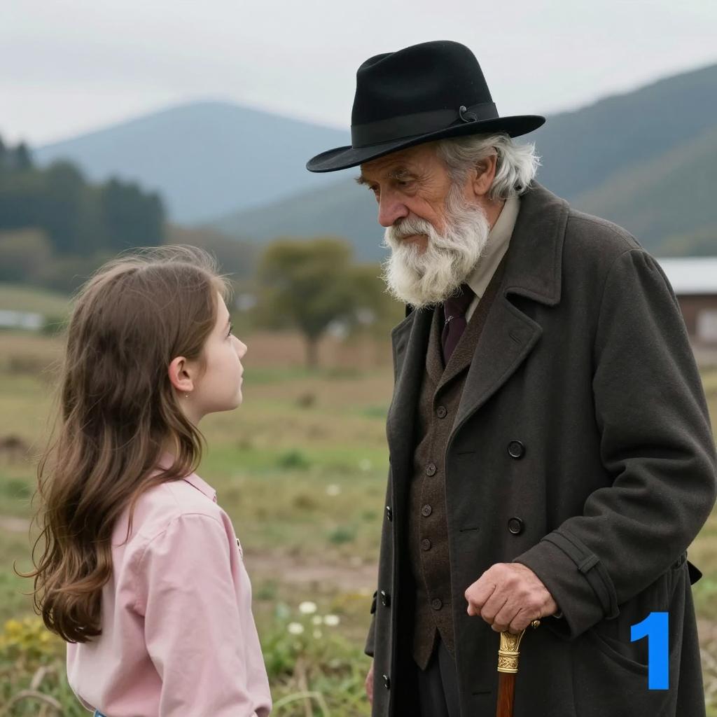 Photograph of two people in a snowy landscape. An elderly woman in a dark cloak stands, holding a wooden bucket. A bearded man with gray hair crouches beside her. Wooden structure on the right, clear blue sky, mountains in the background. Snow-covered field with sparse vegetation. Woman's expression neutral, man's expression focused.