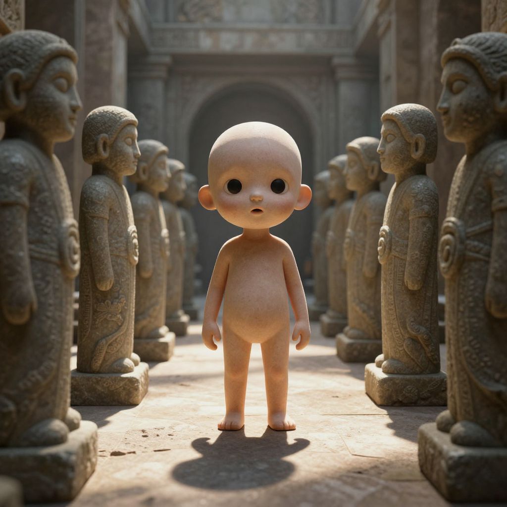 In a hallowed hall of stone and shadow, a curious child stands amidst rows of silent sentinels, their gazes fixed yet unseeing, as if caught in an eternal dance between innocence and the weight of history, evoking a poignant sense of solitude and the quiet mystery of existence.