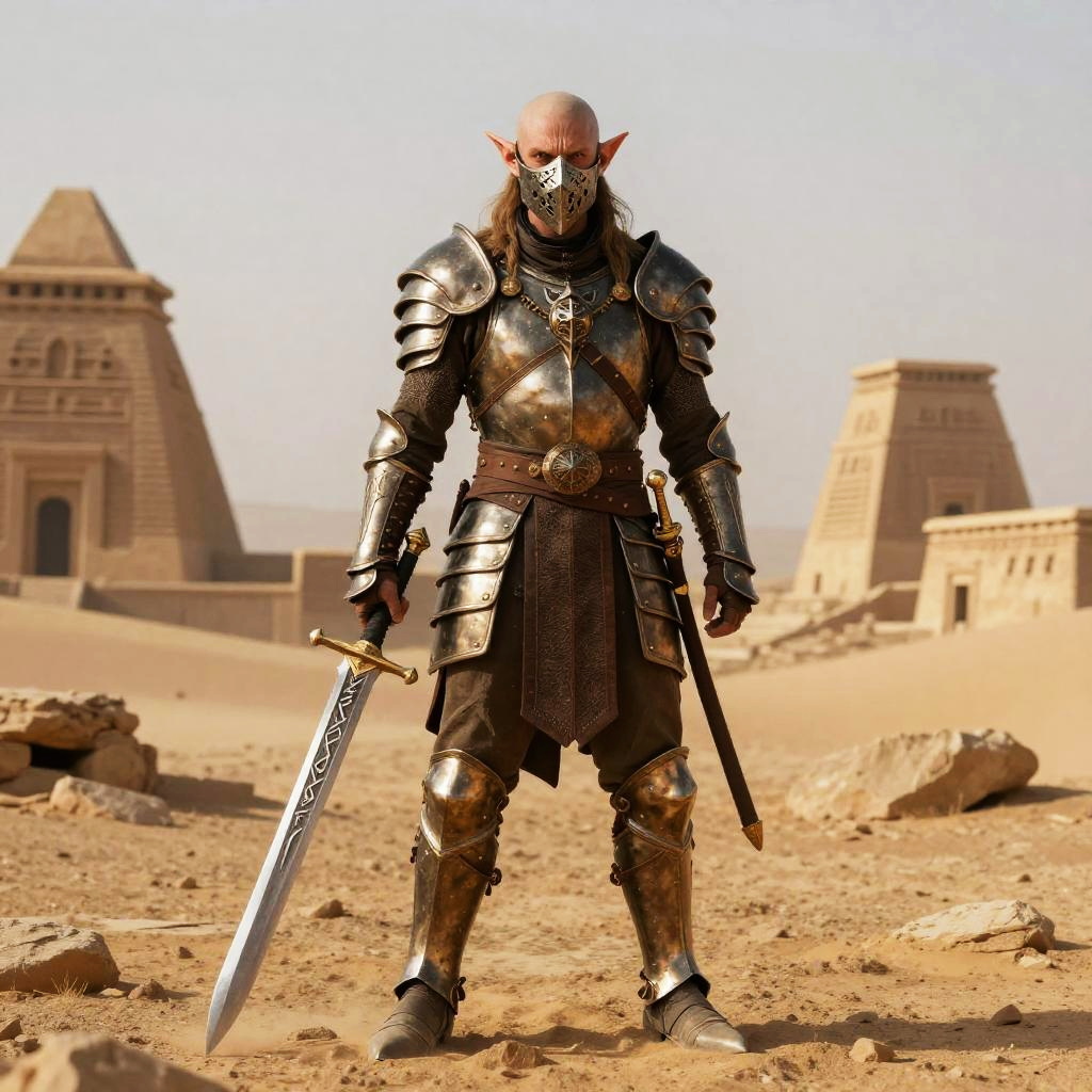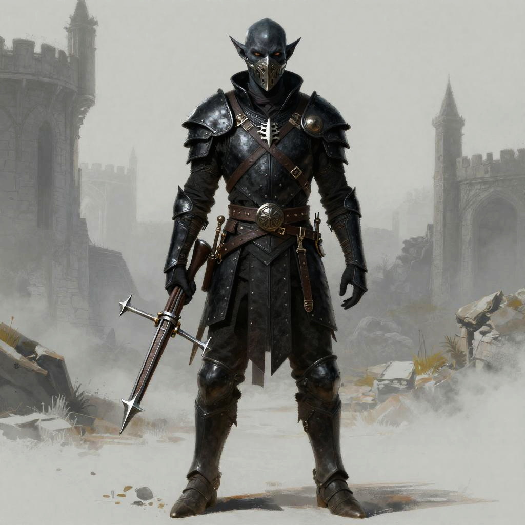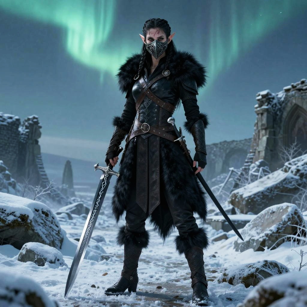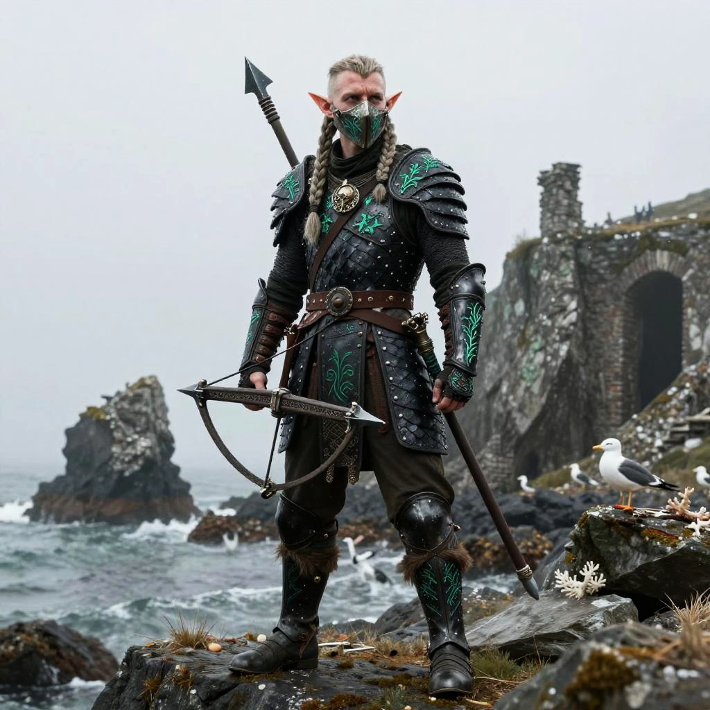 Full-body portrait of a half-orc warrior with intricate tattoos, clad in rugged leather armor, sharp tusks and fierce gaze, wearing a Norse face mask, wielding a double-headed battle axe, in a crumbling mountain fortress. Fantasy art, concept art style, simple background.