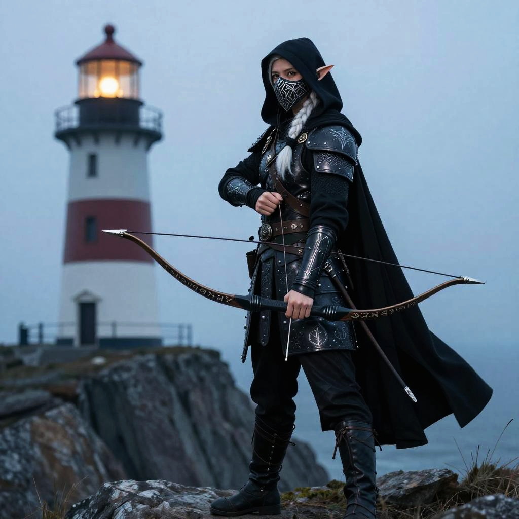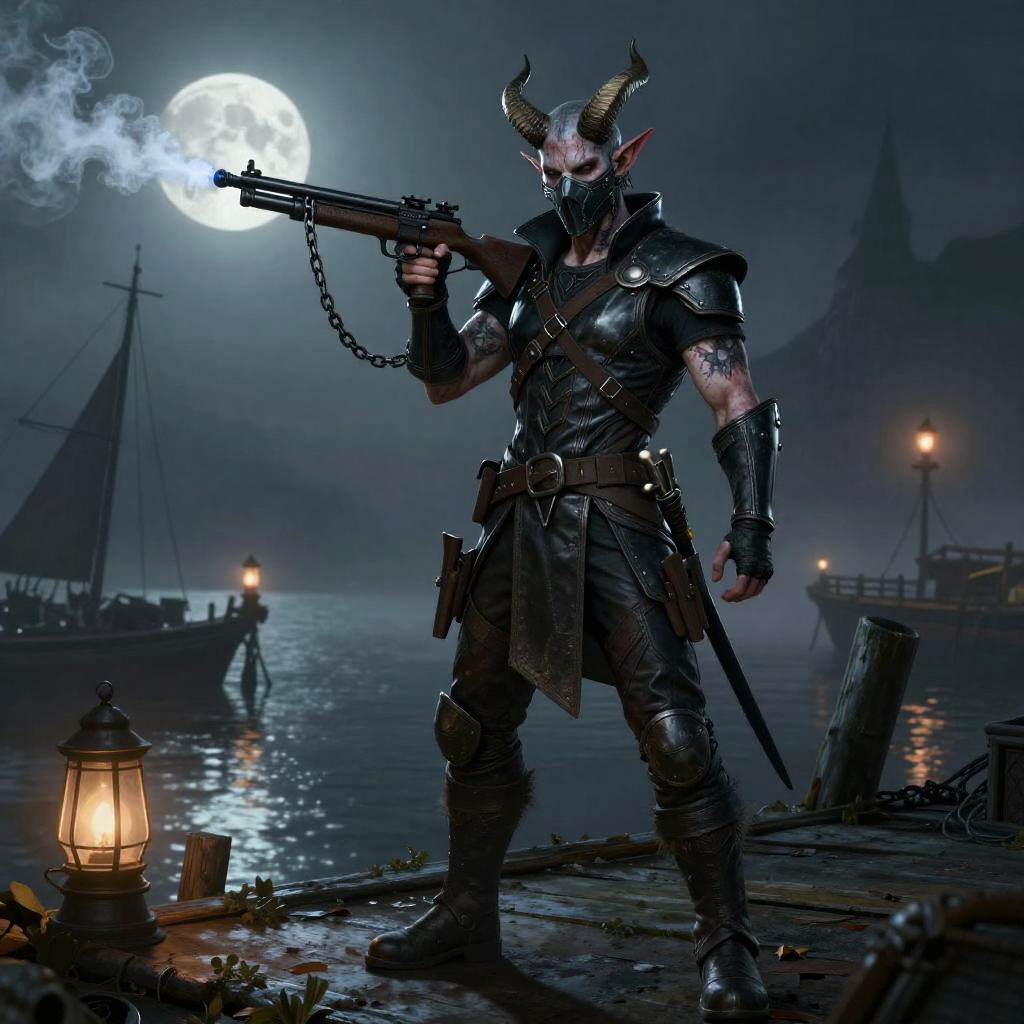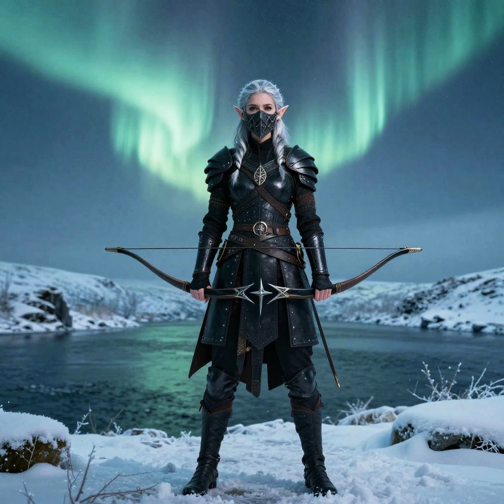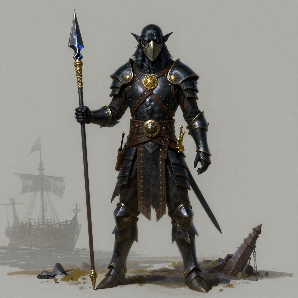 Full-body portrait of a half-orc warrior with intricate tattoos, clad in rugged leather armor, sharp tusks and fierce gaze, wearing a Norse face mask, wielding a double-headed battle axe, in a crumbling mountain fortress. Fantasy art, concept art style, simple background.