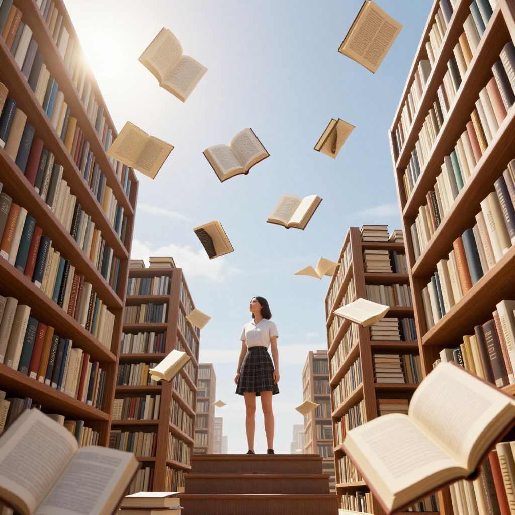 Photograph of a young woman in a white shirt and plaid skirt standing on library stairs, surrounded by flying open books under a bright blue sky.
