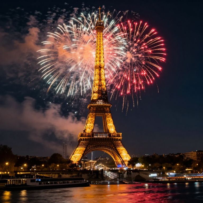 The image captures a breathtaking scene of fireworks illuminating the night sky over Paris. The Eiffel Tower, a towering structure of steel and glass, stands majestically in the center, its silhouette illuminated by the vibrant display of fireworks. The fireworks, in hues of red, orange, and white, burst in the sky, creating a dazzling spectacle that contrasts beautifully with the dark, cloudy backdrop. The Seine River, reflecting the lights of the city and the fireworks, flows gently through the scene, with boats gently floating on its surface. The buildings lining the riverbank are adorned with warm, golden lights, adding to the festive atmosphere. The overall composition is a harmonious blend of natural and man-made elements, creating a sense of awe and wonder.