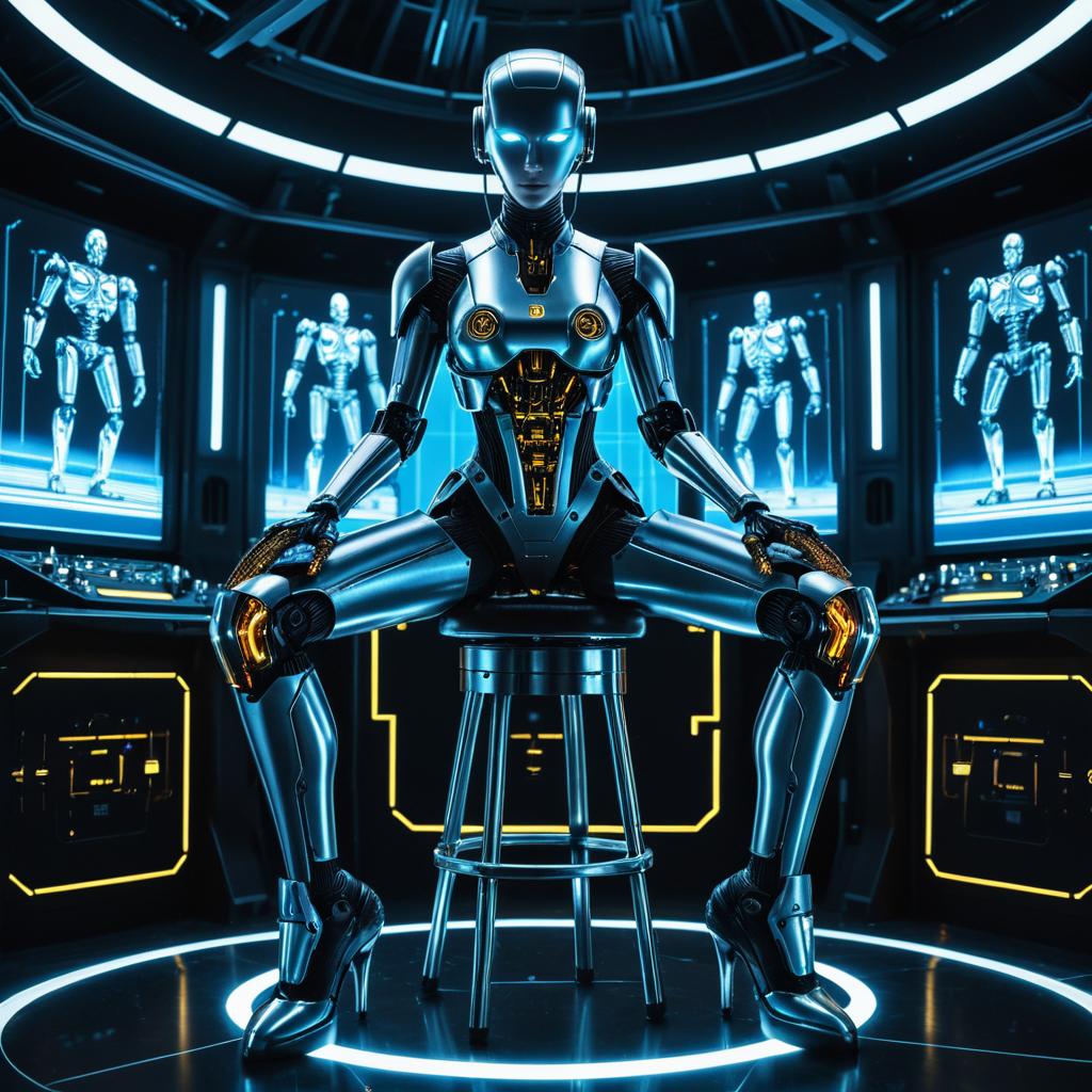 A highly detailed futuristic android woman sitting on a transparent stool in a high-tech environment surrounded by glowing blue and purple holographic displays. She wears a metallic, form-fitting bodysuit with matching high-heeled boots and mechanical accessories, highlighted by dramatic lighting that accentuates rich textures and electric details. The setting evokes a cyberpunk aesthetic with vibrant colors and cinematic style.