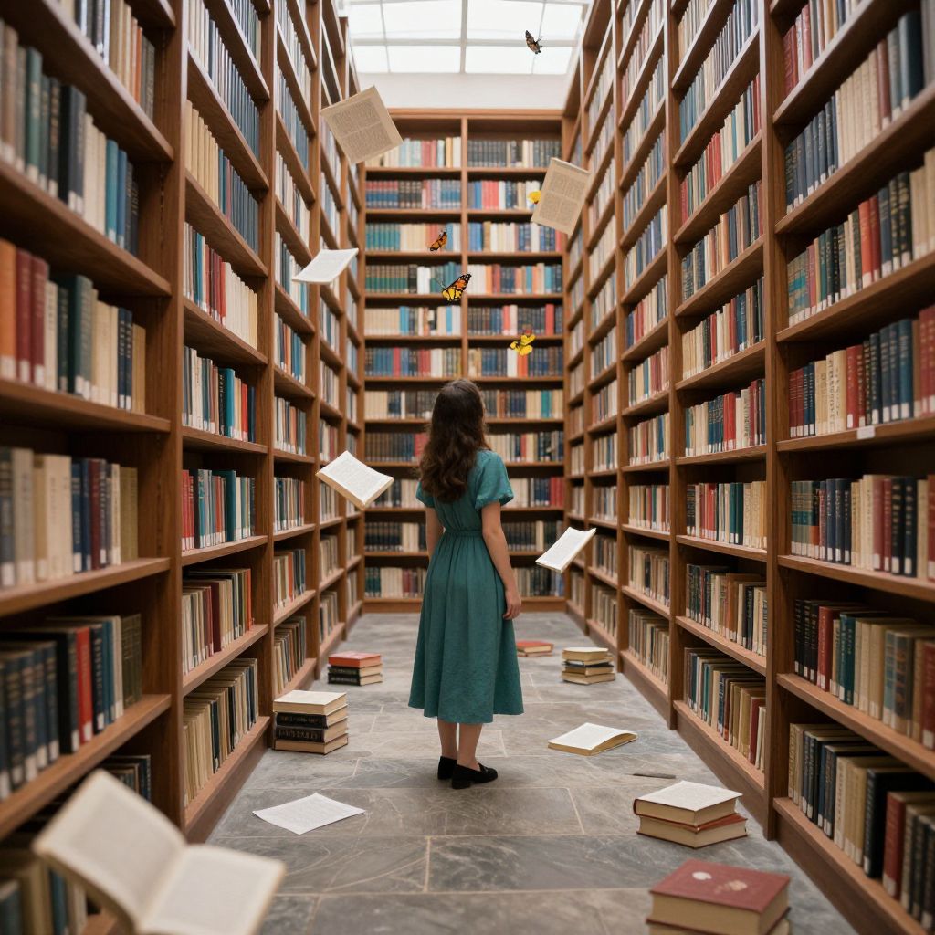Books float gracefully above a stone-tiled aisle in a vast library, surrounded by towering shelves filled with colorful spines, as a woman in a teal dress stands amidst scattered volumes, watching butterflies flutter among the spectral pages.