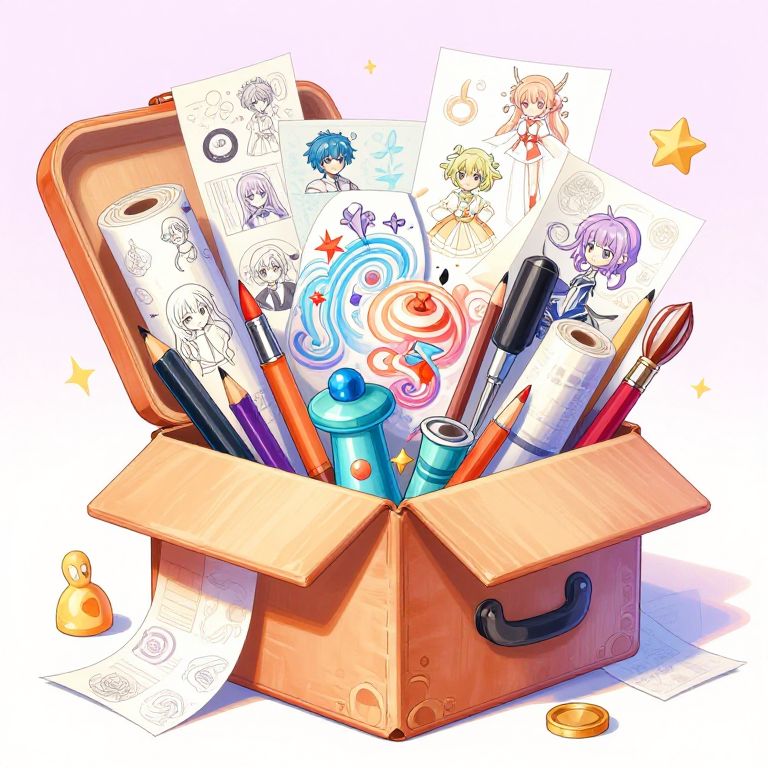Vibrant digital illustration of an open, brown cardboard box filled with colorful art supplies, including pencils, markers, and sketches of anime-style characters.