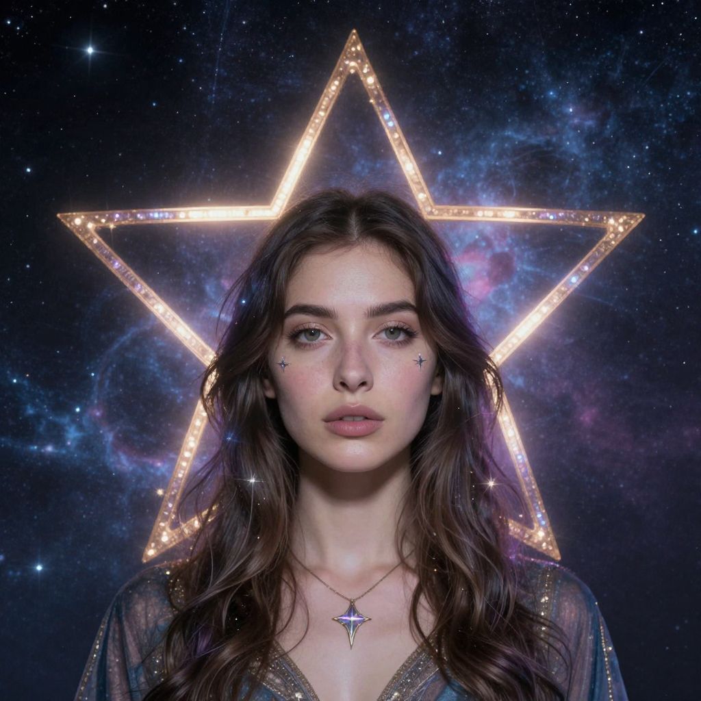 A woman with a star-shaped halo and cosmic background, evoking a sense of stardust and celestial connection.