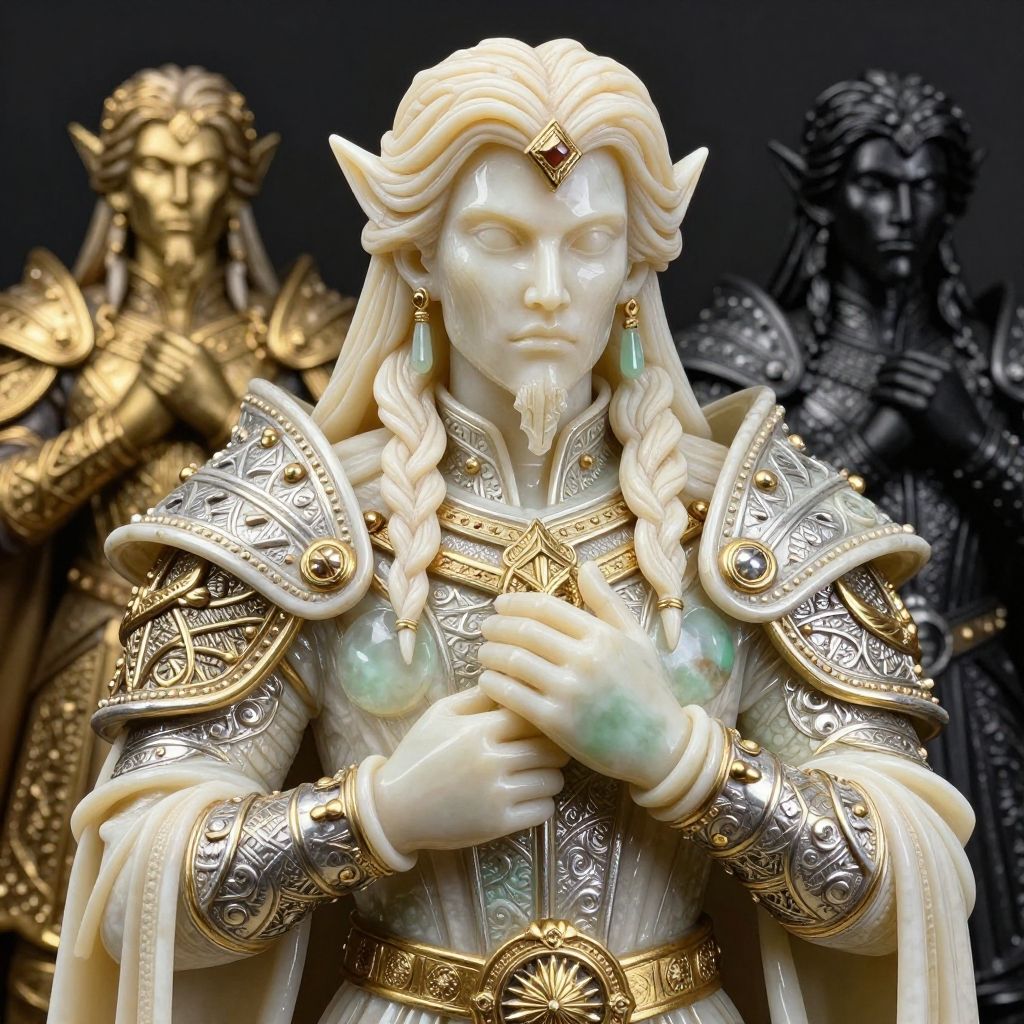 Ivory and ebony and gold and silver and jade sculpture of Lieutenant Kirtar Trish Mistric, natural, shimmering, vibrant, gothic, rpg, 1400ad, ultra detailed, detailed, immersive, reminiscent of high fantasy RPG games, HD, masterpiece, best quality, hyper detailed, super realistic, perfect face, perfect hands, award-winning, professional, breathtaking, linquiveracharming Peninsulasuitable weatherretail packaging style . vibrant, enticing, commercial, product-focused, eye-catching