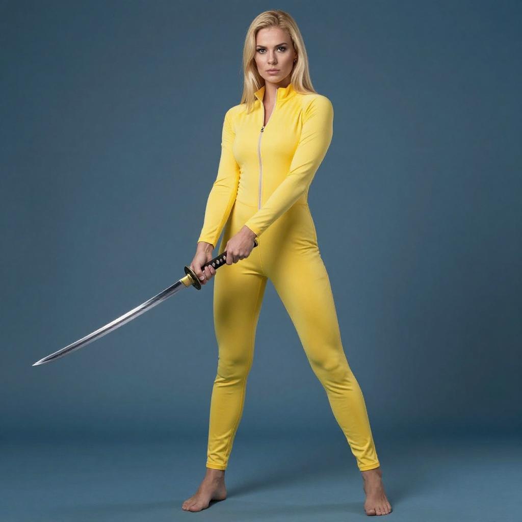 Photograph of a blonde woman kneeling on the floor, wearing a shiny yellow long-sleeve top and high-cut bottoms, black thigh-high boots, and holding a curved sword overhead with her right hand. She has red lipstick and a confident expression. The background is a plain, light-colored studio setting.