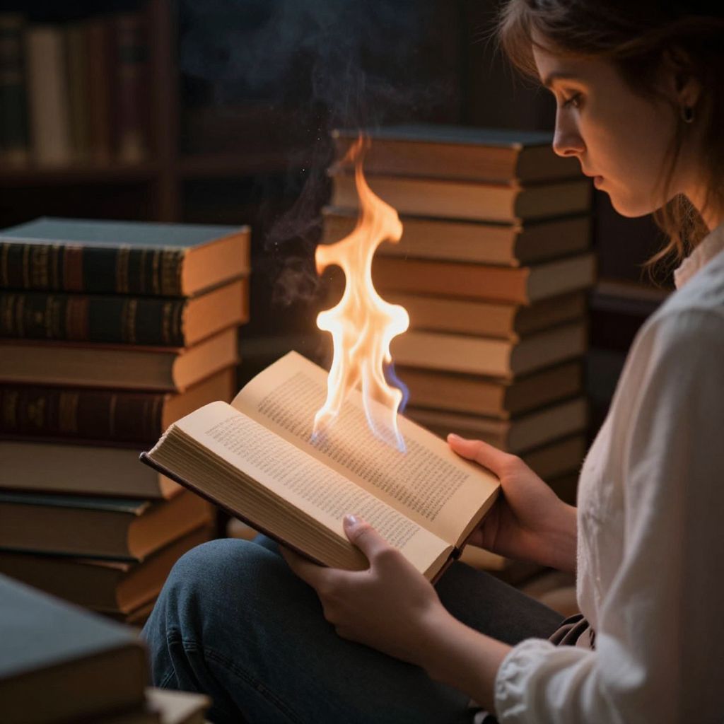 Flickering flames illuminate a serene scene as a woman engrossed in reading holds an open book, her hands gently cradling its pages while stacks of ancient tomes smolder behind her, casting an ethereal glow over the dimly lit library.