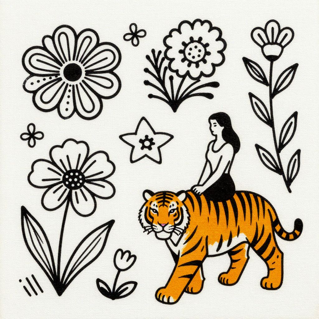 Illustration of a black-haired woman riding an orange tiger, surrounded by black-and-white floral and star motifs, in a vibrant, playful style.