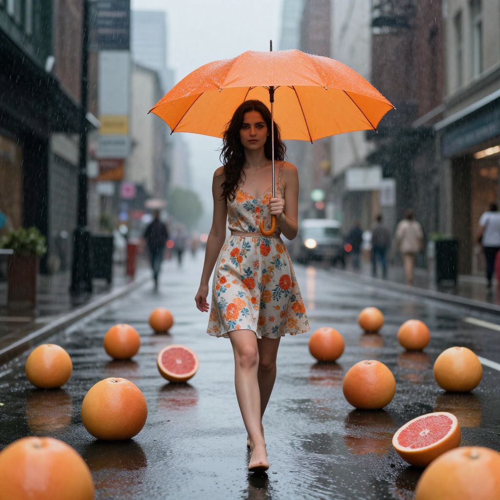 Photograph of a young woman with wet, wavy brown hair, wearing a white, floral sundress, and barefoot, walking down a rain-soaked city street under an orange umbrella. The street is lined with large, floating oranges and halved oranges. The background shows blurred, gray buildings and a few pedestrians. The image has a surreal, dreamlike quality with vivid colors contrasting the dark, overcast sky. The wet street reflects light, adding a glossy texture. The woman's confident stride and bright umbrella create a striking focal point.