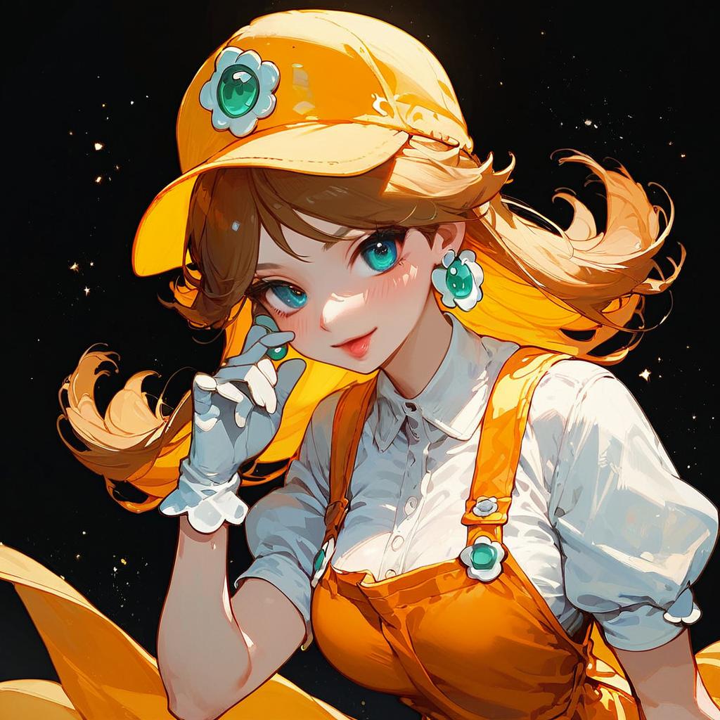 Score_9, score_8_up, score_7_up, princess daisy, solo, breasts, (yellow d cap, orange overalls:1.2), rating safe, white gloves, official Nintendo artwork, black background, simple background