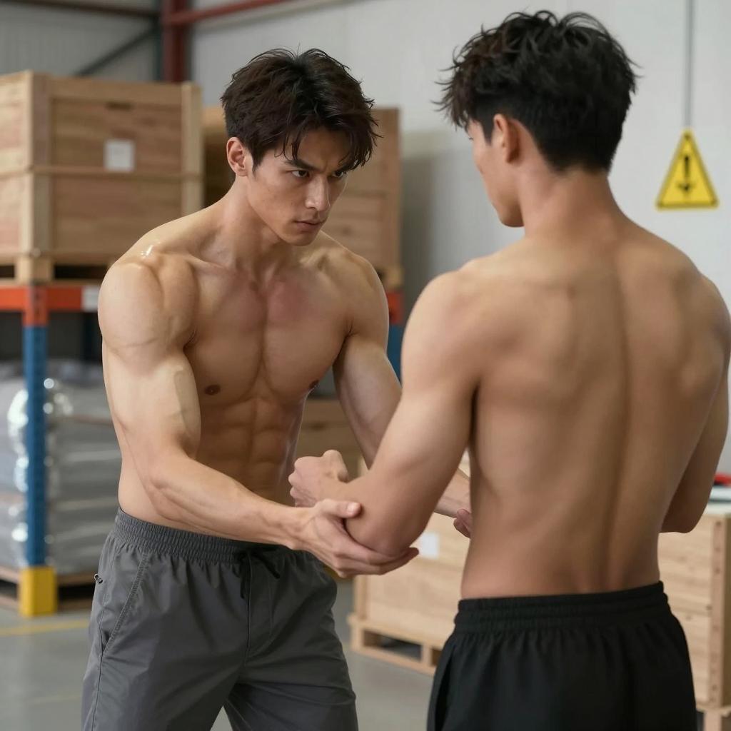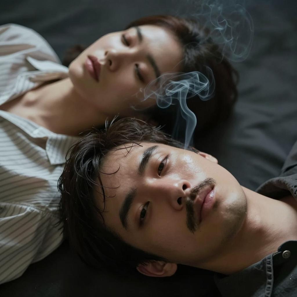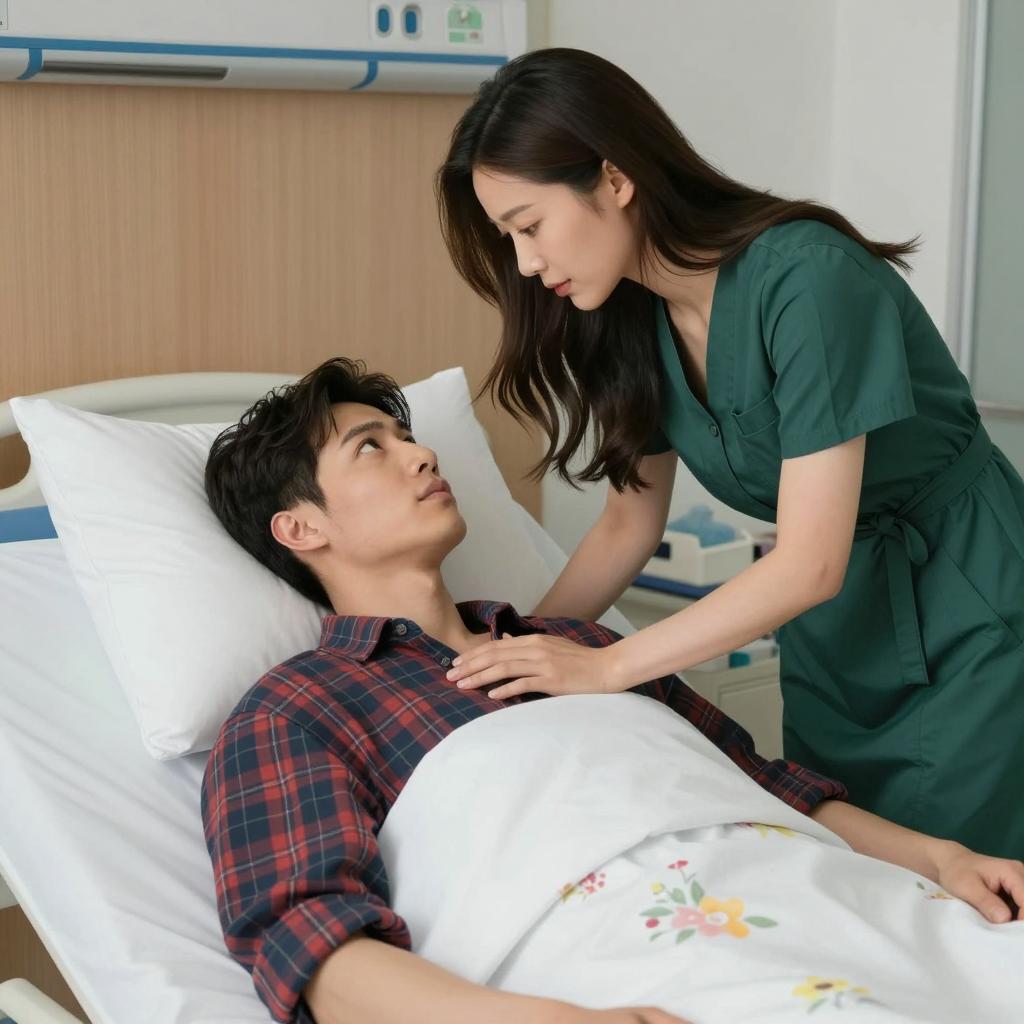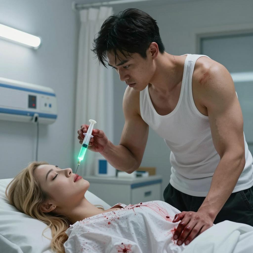 Photograph of a muscular man with blood on his white tank top, holding a glowing green syringe, leaning over a blonde woman with blood on her clothes, lying in a hospital room with fluorescent lights and white curtains. Man's expression is focused, woman's face is partially visible.