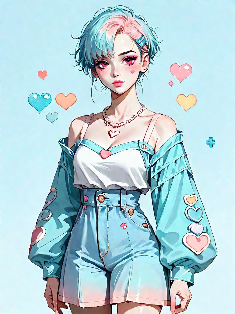 Realistic anime-style illustration of a young woman with short pink hair wearing a pastel pink cut-out A-line dress with short puff sleeves and a heart-shaped cut-out back. She also wears an oversized denim jacket draped over her shoulders and white canvas sneakers. The outfit is accessorized with a minimalistic silver necklace. The illustration features two poses, one showing the back and side profile, and the other a front full-body view.
