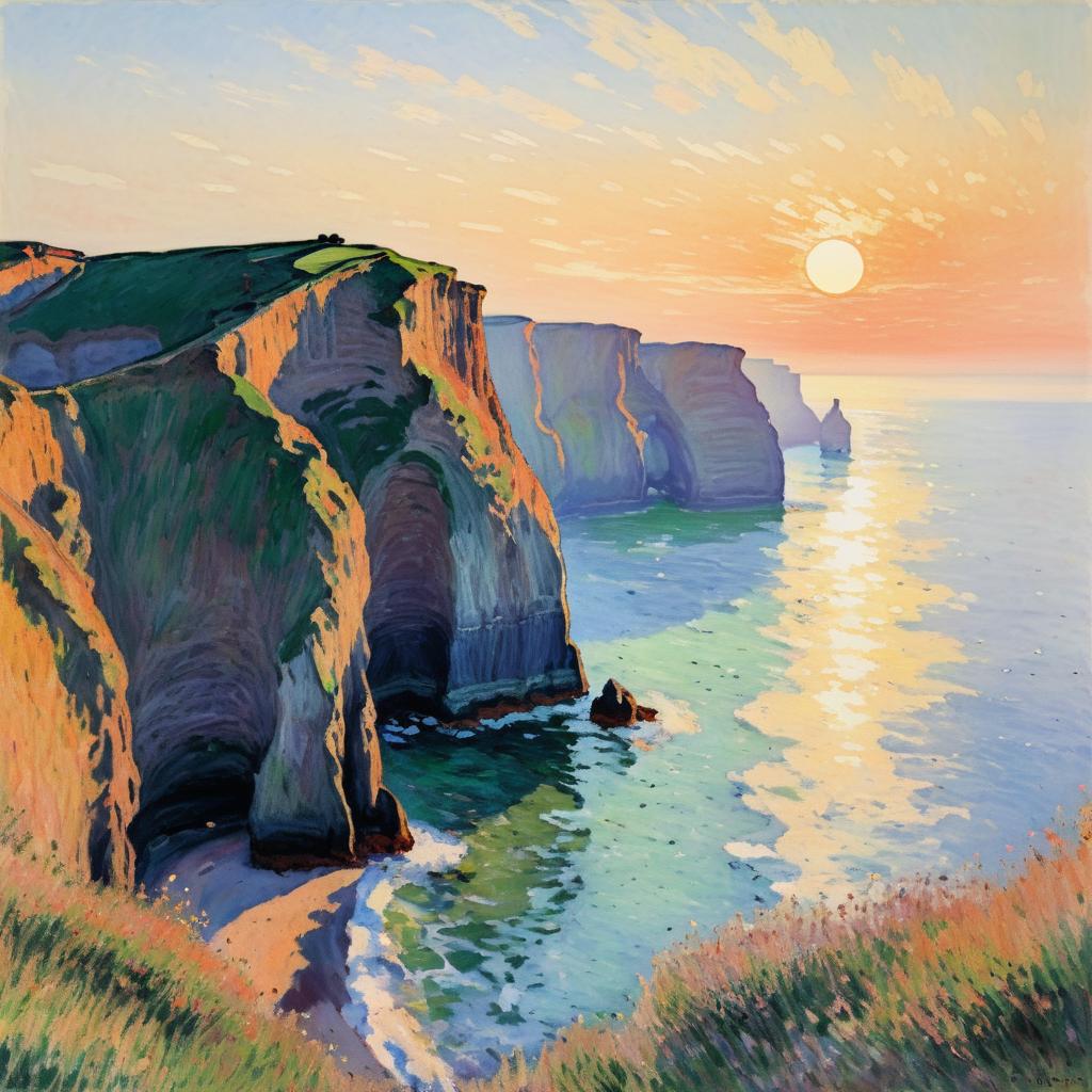 Detailed illustration of coastal cliffs at sunset by Claude Monet, showcasing a serene landscape.