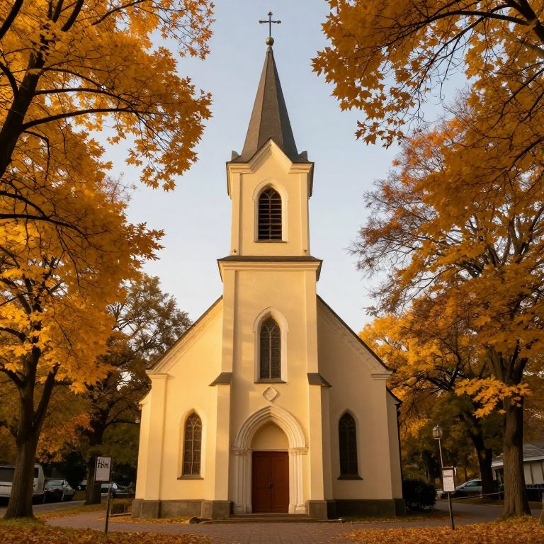 Enveloped by the golden embrace of autumn, a quaint church stands as a sanctuary of serenity, its warm glow inviting contemplation amidst the transient beauty of nature’s seasonal dance.