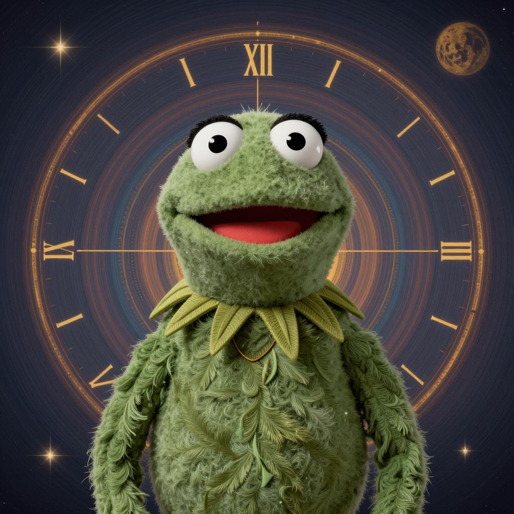 Photorealistic and intricately detailed image of a Kermit the Frog-inspired muppet with lush green textured fur and a ruffled collar, set against a surreal, psychedelic backdrop featuring a large golden clock with Roman numerals and a celestial moon. The composition follows the rule of thirds and the golden ratio, emphasizing a time loop theme in an 8K ultra-high definition style blending surrealism and photorealism.