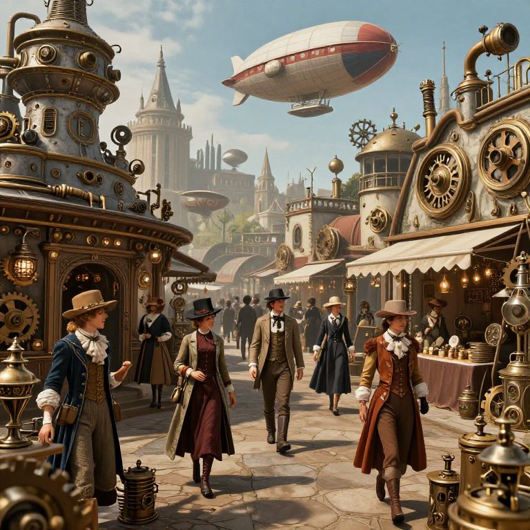 Steampunk island marketplace with cobblestone paths lined by gear-driven shops, steam-powered vehicles, explorers in leather and goggles, warm glowing lamps at dusk