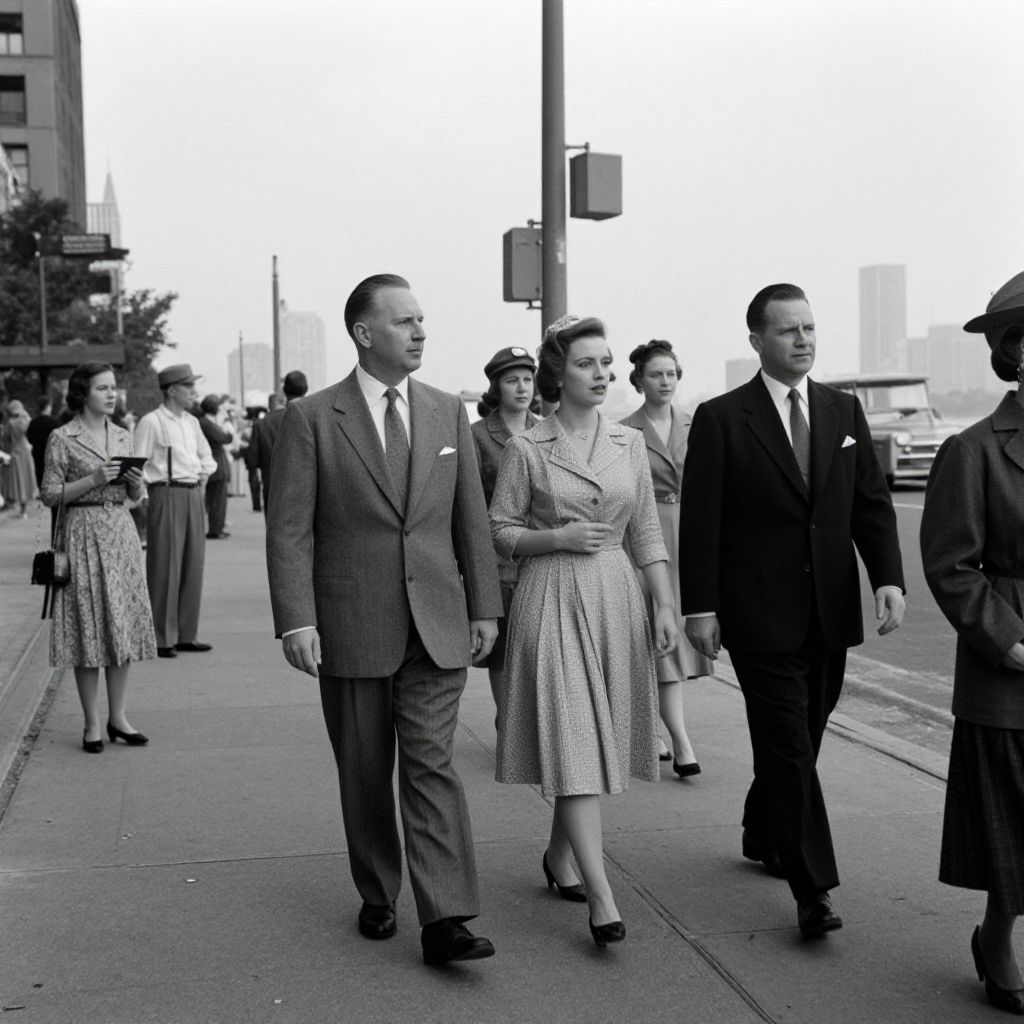Pedestrians stroll along a bustling street near the East River on a Saturday afternoon in 1941, with a group of formally dressed individuals, including a woman in a knee-length dress, walking arm-in-arm while others observe from the sidewalk.