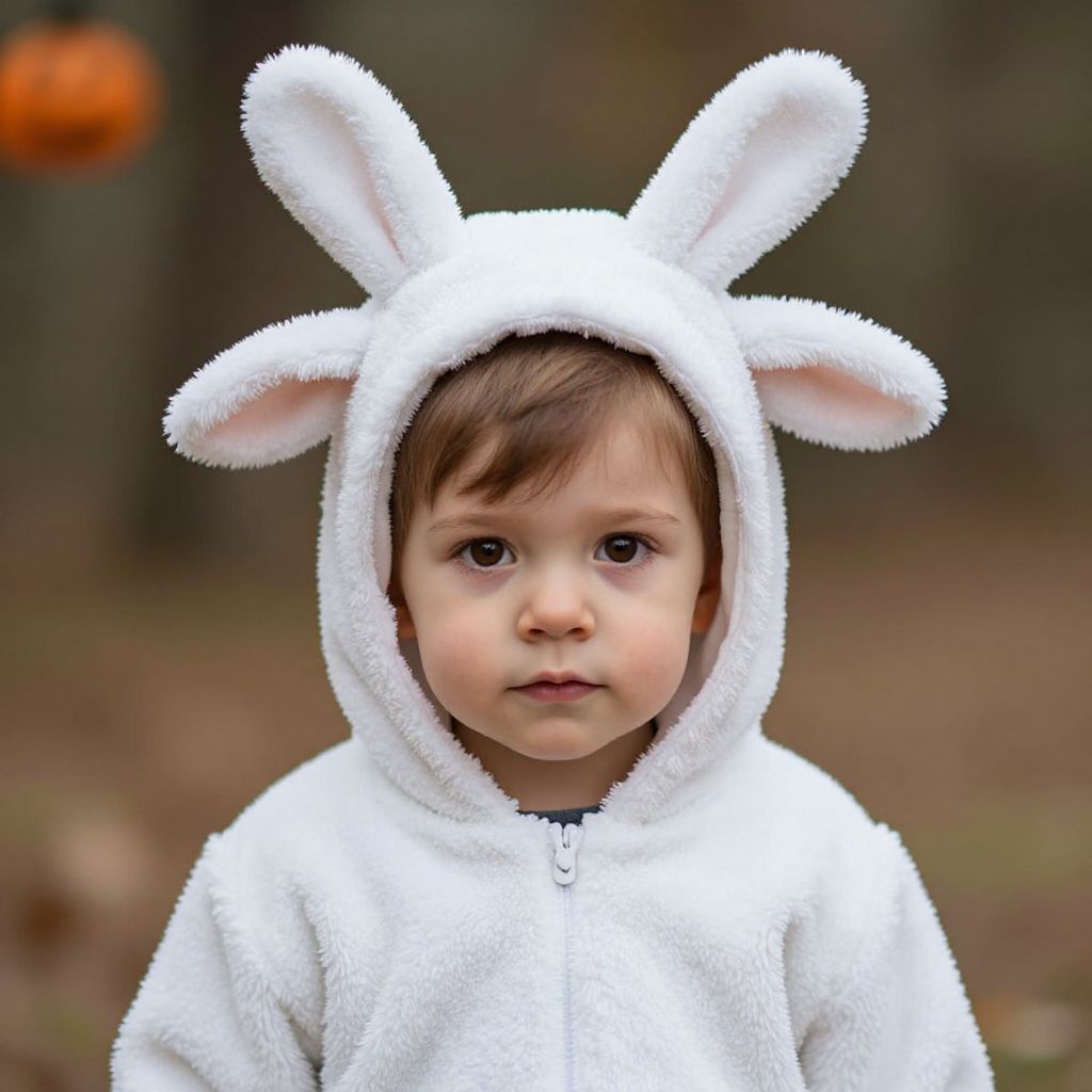 Photograph of a young child with fair skin and brown hair, wearing a white, fluffy hooded onesie with bunny ears. The child's large, dark eyes gaze directly at the camera. The background is blurred, featuring muted brown and green tones, suggesting an outdoor setting. The child's expression is neutral, and the texture of the onesie appears soft and plush. The image is sharp in the foreground, with a shallow depth of field that keeps the focus on the child's face and the bunny ears. An orange object is slightly visible in the blurred background.