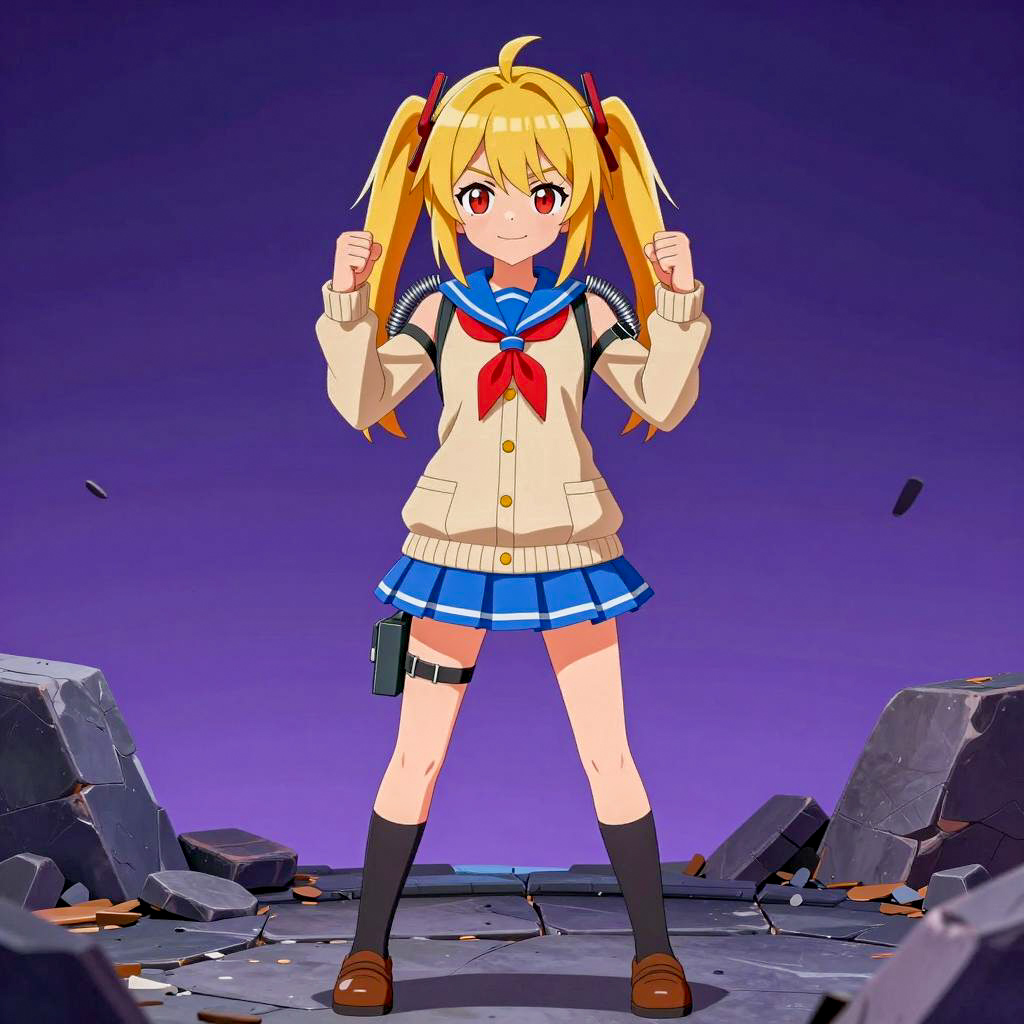 CGI anime-style character standing with fists up. Blonde hair in pigtails, red eyes, smiling. Wearing beige cardigan with red neckerchief, blue skirt, black thigh-high socks, brown shoes. Metal coils attached to shoulders, small boxes on thighs. Background is dark purple. Character is on a stone platform with broken stone pieces around. Character has intense expression. Number of people: 1.
