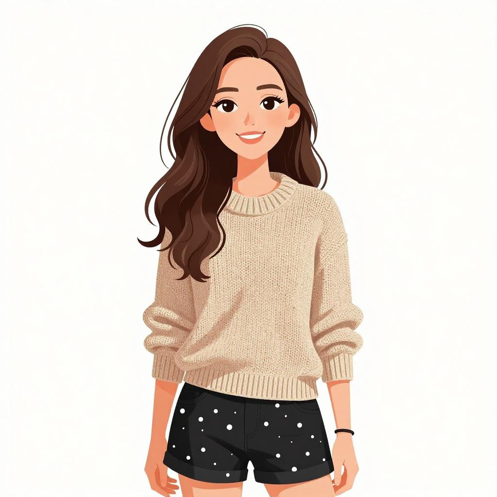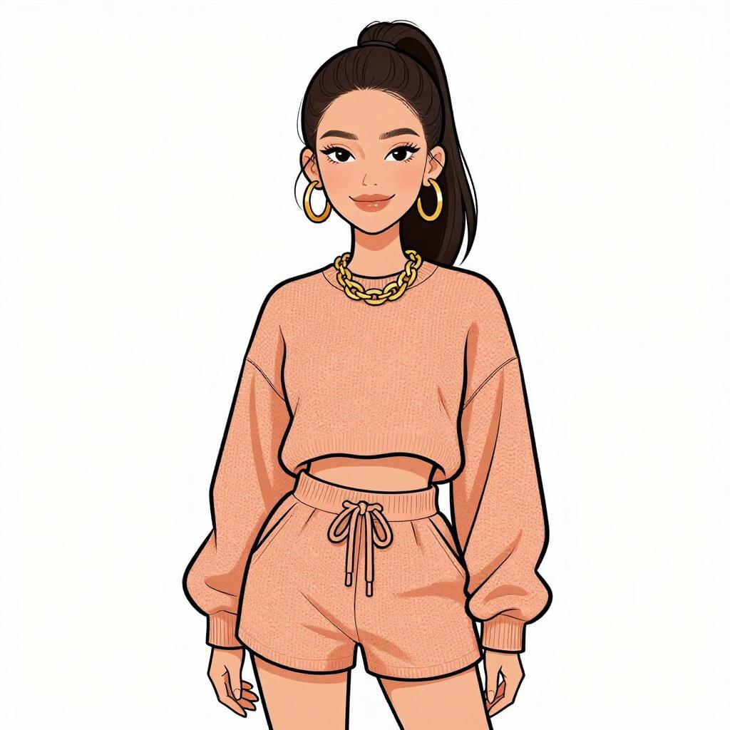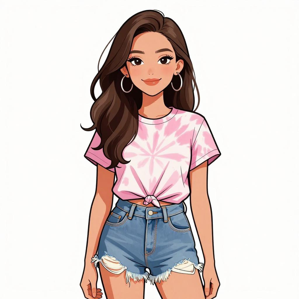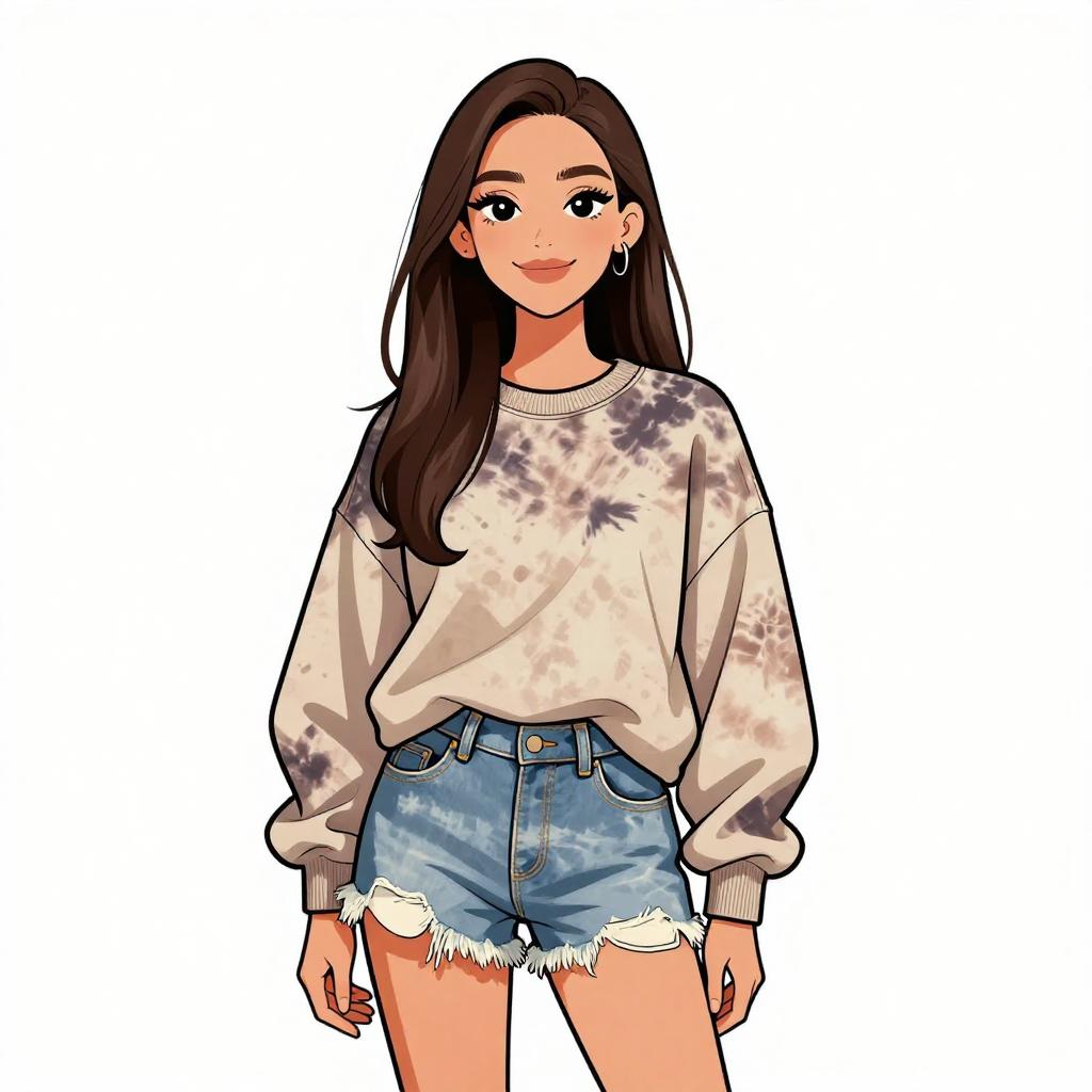 Woman with pretty face and pretty hair. smiling Woman, casual urban, oversized tie-dye sweatshirt in neutral tones, drop shoulders, long balloon sleeves, crew neck, matching tie-dye shorts with frayed hem, understated makeup, straight long hair, white studio background. --sref 1467
