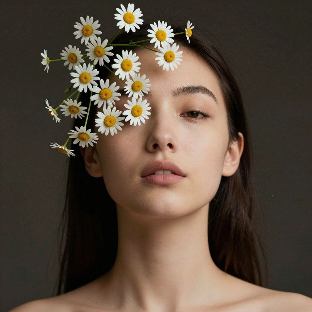 Elegant daisies cascade gracefully over a woman's upturned face, their vibrant petals and golden centers contrasting against her serene expression and the enigmatic, speckled backdrop.
