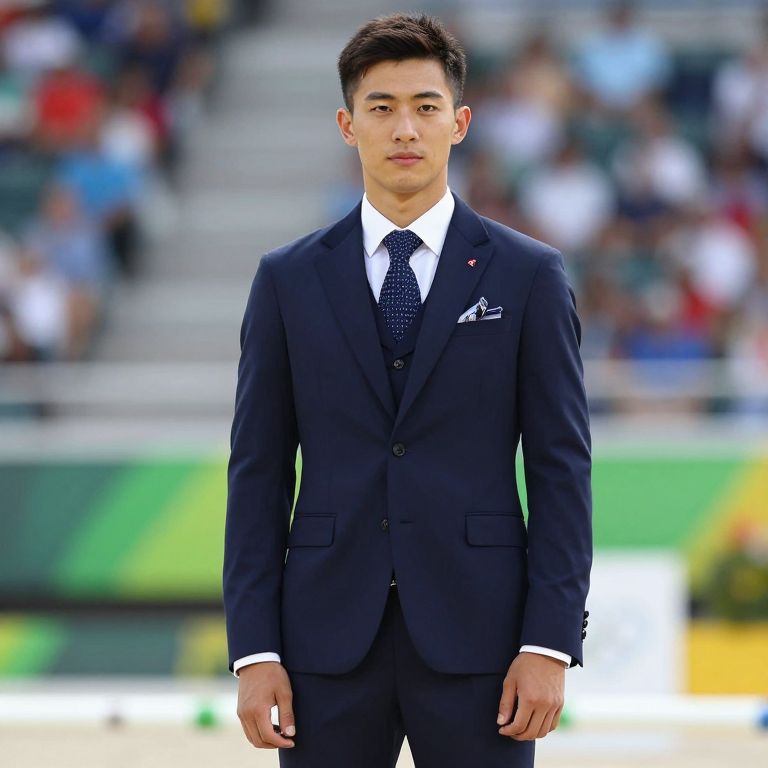 Olympic equestrian Alex Hua Tian stands confidently outdoors, wearing a bespoke navy blue three-piece suit by Gieves & Hawkes, featuring a crisp white shirt, a dark blue polka-dot tie, and a neatly folded pocket square with floral accents, embodying classic Savile Row tailoring for the Rio 2016 Olympics.