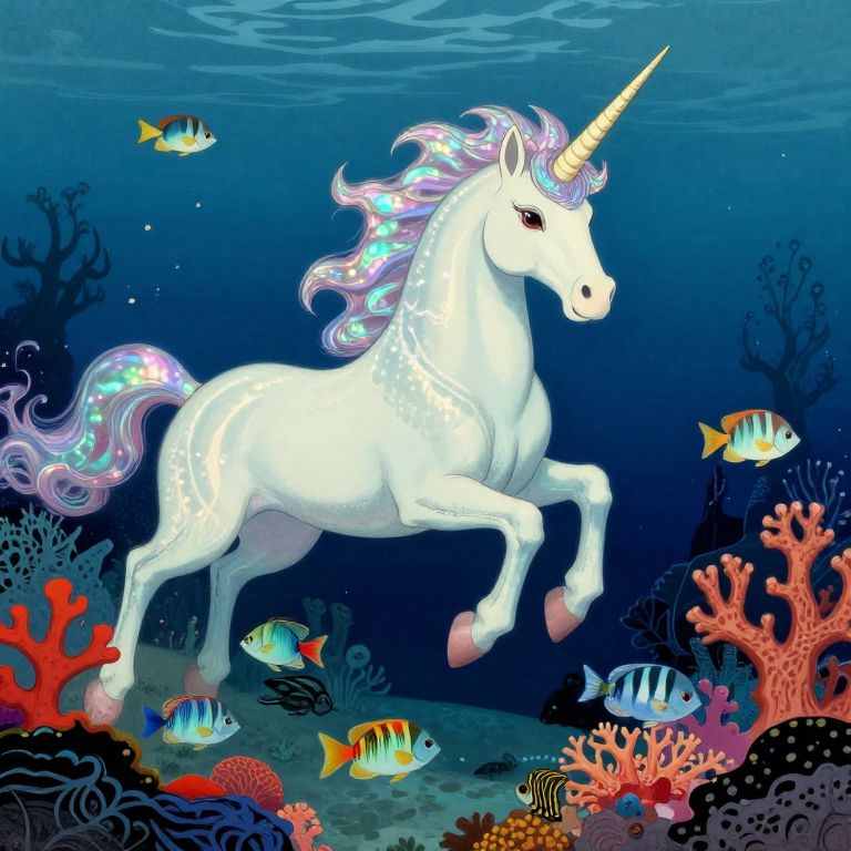 Imagine an enchanting underwater world reminiscent of Salvador Dalí's dreamscapes, where a majestic mythical creature gracefully glides through vibrant coral gardens and luminous sea creatures. Rendered in the captivating style of Japanese woodblock prints, the creature's otherworldly presence is emphasized by its shimmering opalescent mane and horn that illuminate mesmerizing light patterns on the surrounding aquatic life. Captured from an insect-like perspective, this image showcases the unicorn's reflection dancing across iridescent scales of tropical fish following in its wake, creating a harmonious blend of color and movement that evokes both awe and serenity.