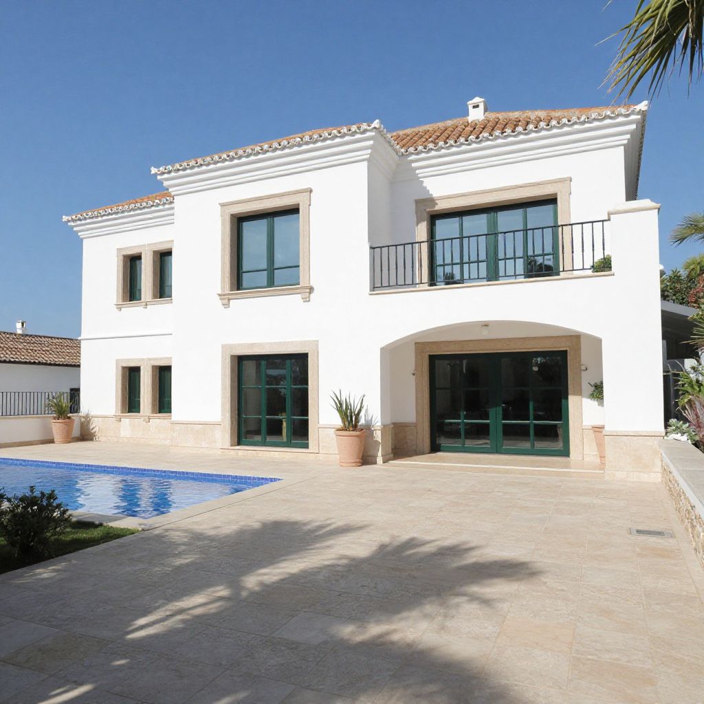 Photograph of a two-story white Mediterranean-style house with red-tiled roof, black-framed windows, balcony, pool, and clear blue sky.