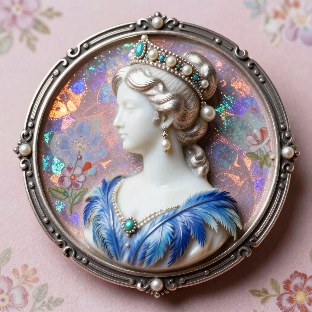 This is a detailed, colorful, and ornate photograph of a vintage-style silver brooch. The brooch features a side profile of a graceful, white porcelain woman with wavy silver hair adorned with a pearl and turquoise bejeweled crown. She wears a blue, feathered dress and dangling pearl earrings. The background is a shimmering, iridescent blend of pink, purple, and orange hues with delicate floral patterns. The brooch is circular and bordered with intricate silver designs.