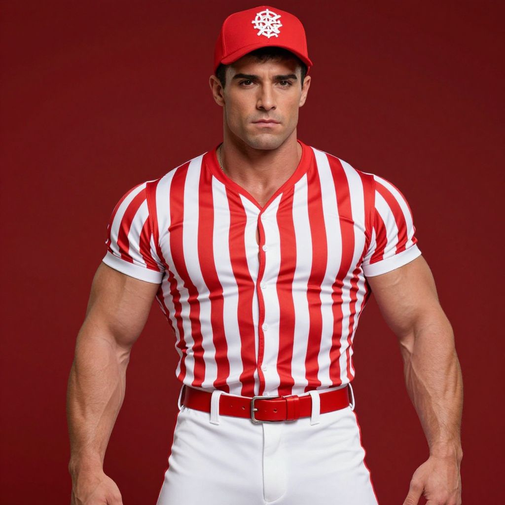A man wearing a red and white striped shirt and white pants with a red belt tied around his waist. He has a red cap on his head with a white emblem on it. The man is tall and muscular, with a strong, athletic build. His face is chiseled, with a confident expression, and his dark hair is neatly styled. The overall scene is vibrant and lively, with the red and white colors creating a bold, eye-catching appearance.
