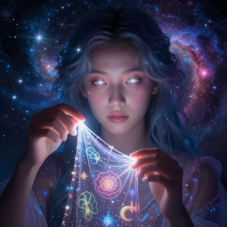 Portrait of a dreamweaver person with radiant eyes, delicate hands weaving glowing threads of dreams into a tapestry of surreal symbols, set against a backdrop of swirling galaxies and nebulas, infused with fantasy and mystery in a dreamy palette.