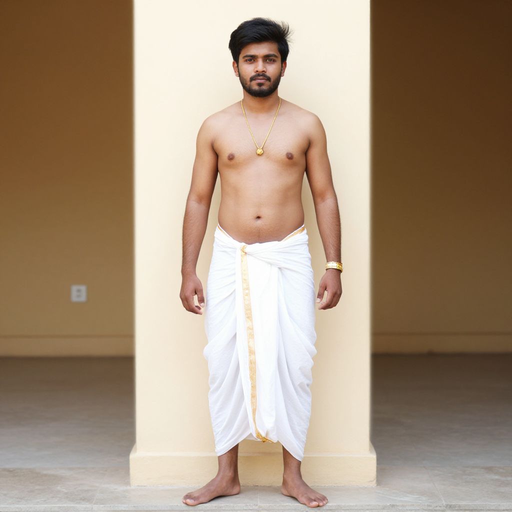 Photograph of a shirtless young South Asian man with a medium build, short black hair, and a trimmed beard, standing in a brightly lit rectangular doorway. He wears a white dhoti (a traditional Indian garment) around his waist, barefoot, and accessorized with a gold necklace and a gold bracelet on his right wrist. The background is a beige, empty room with smooth walls and a polished floor. The lighting creates a strong contrast, highlighting the man's figure against the darker background.