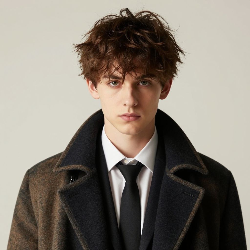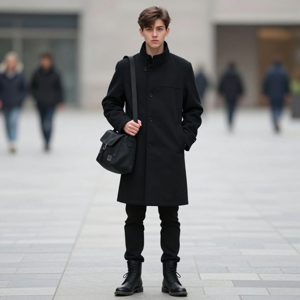 Photograph of a young man with short brown hair, wearing a black coat, black pants, and boots, carrying a black bag, standing in a