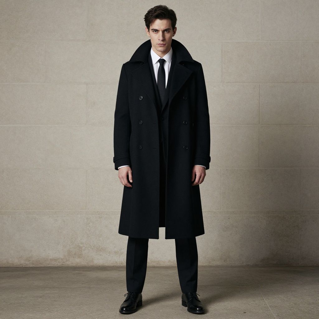 Photograph of a young Caucasian man with short, brown hair, standing in an urban plaza. He wears a long, black overcoat, black pants, and black boots. He carries a black leather satchel over his right shoulder with his left hand in his coat pocket. The background is blurred, showing indistinct figures of people walking and modern buildings with large glass windows. The plaza has a tiled, white-and-gray patterned floor. The man's expression is neutral, and he stands confidently, centered in the frame. The overall style is modern and minimalist.
