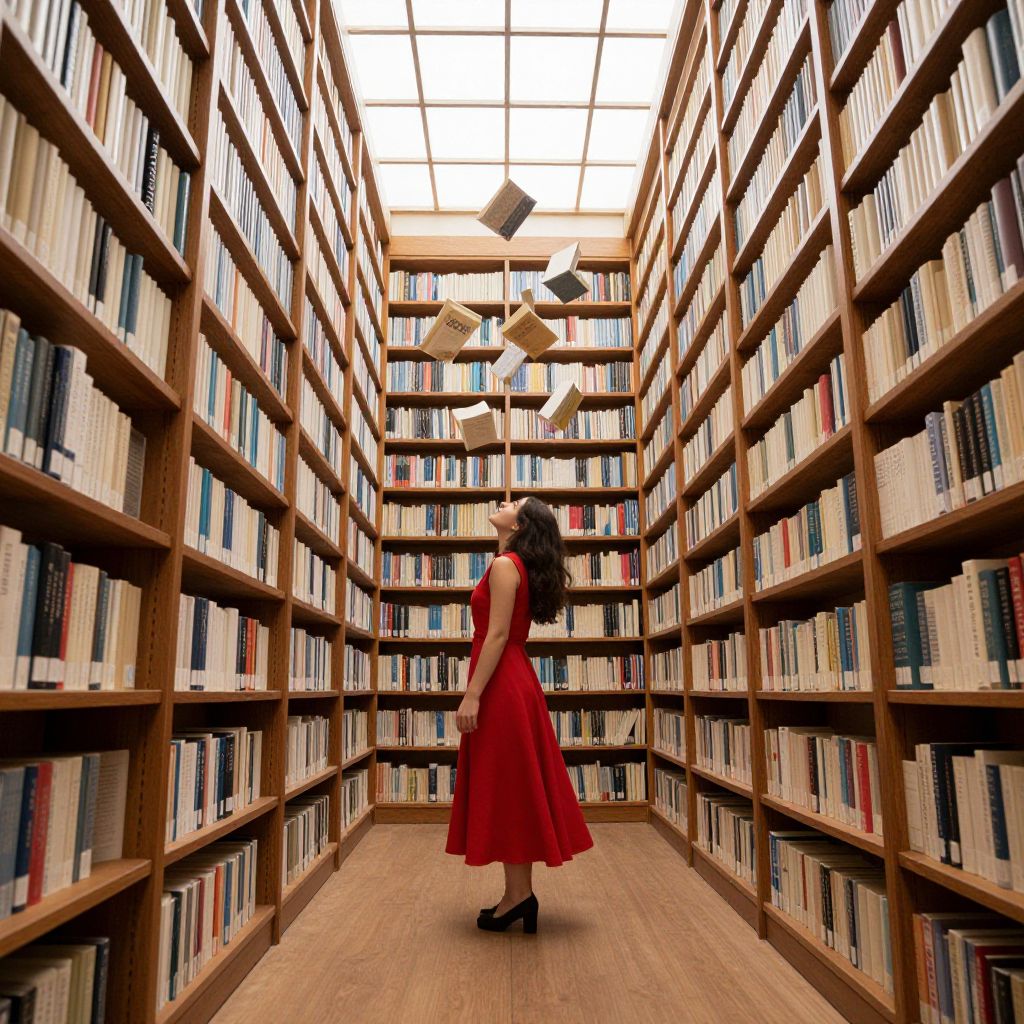 Photograph of a woman with long dark hair, wearing a sleeveless red dress and black shoes, standing in the center of a narrow library aisle. She faces away from the camera, gazing at tall, wooden bookshelves filled with colorful books on both sides. The ceiling is glass-paneled, allowing natural light to illuminate the scene. Several books are falling from the top shelves, suspended mid-air. The wooden floor contrasts with the vibrant colors of the books. The overall atmosphere is serene yet dynamic with the falling books adding movement.