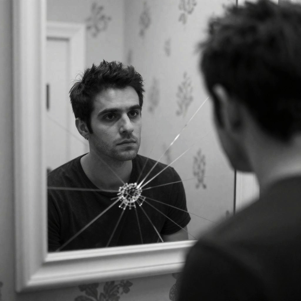 Black and white photograph of a man with short, dark hair staring into a mirror with a cracked glass. He wears a dark shirt, reflecting a somber expression. Floral-patterned wallpaper is in the background. The man's back is partially visible, showing his side profile. The mirror has multiple cracks.