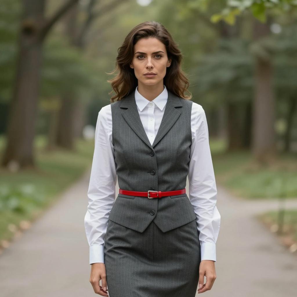 Dress waistcoat ladies, photorealistic, woman standing in forest path, daytime, brown wavy hair, white shirt, gray pinstripe vest and skirt, red belt, serious expression, green trees, blurred background, natural light, medium shot, professional outfit, realistic ure, soft focus