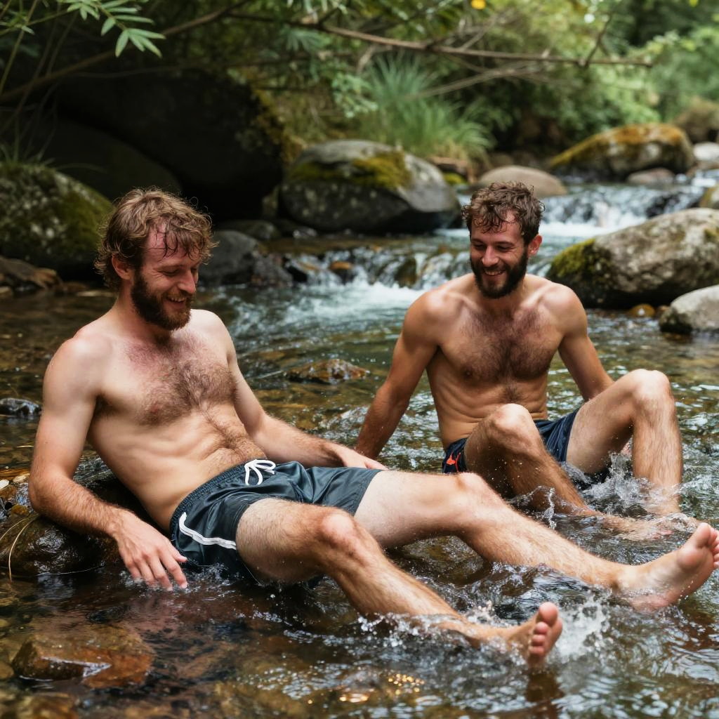 Hairy men in boxers playfully splashing in a shallow mountain stream, crystal clear water reflecting sunlight, relaxed and joyful expressions, natural setting with lush greenery