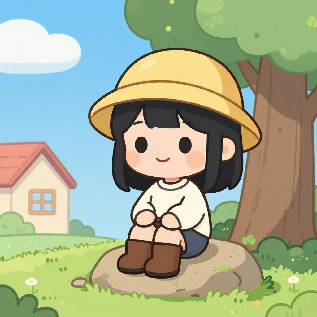 Masterpiece, best quality, chibi, 1girl, tree, solo, outdoors, brown footwear, day, sky, sitting, cloud, hat, house, black hair, grass, smile, blue sky, black eyes, heart, building, window, bush, boots, bangs, long sleeves, rock, medium hair, shirt
