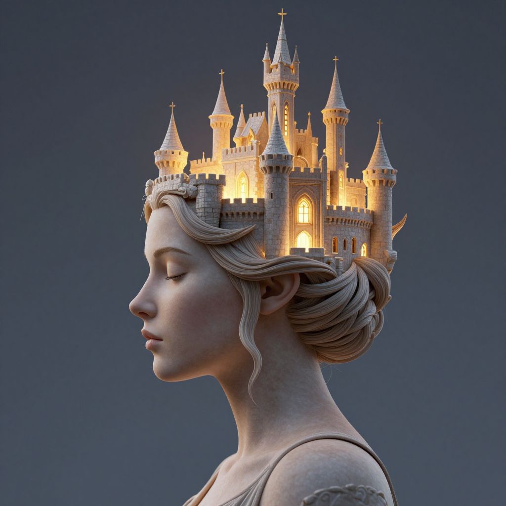 A surreal 3D render depicts a serene profile of a woman whose head seamlessly transitions into a fantastical castle, illuminated by warm, golden lights, symbolizing the dreamlike architecture crafted by the imagination of sleeping monarchs, governed by laws that manifest only during REM cycles.