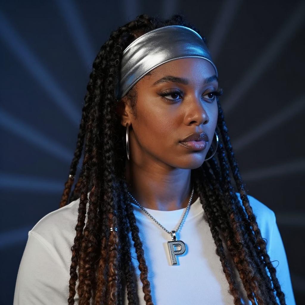 Portrait of a woman with long, thick dreadlocks wearing a silver metallic headband and a white shirt. She accessorizes with large hoop earrings and a silver necklace featuring a large letter 'P'. Blue lighting highlights her face, with a dark background enhanced by circular light patterns creating a dramatic atmosphere. The woman has a neutral expression and is looking slightly to the side.
