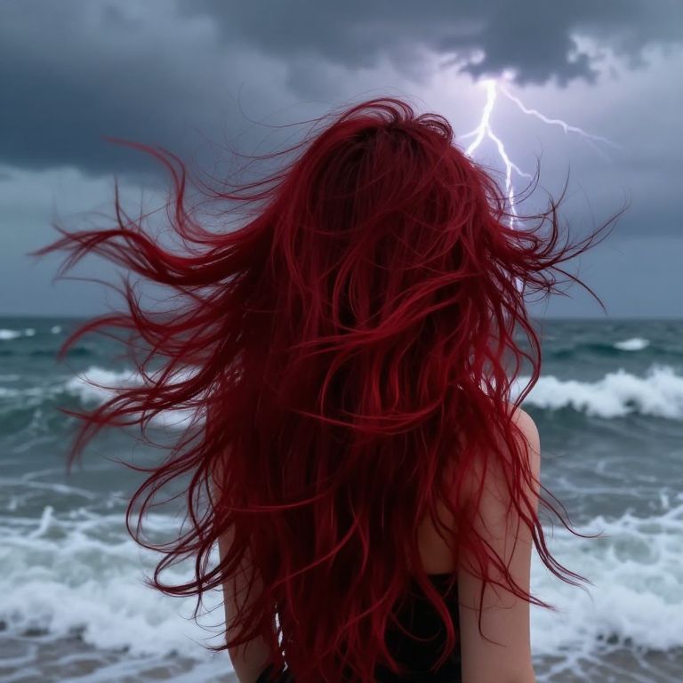 Dark red hair flowing wildly in the wind, set against a stormy sea backdrop with dark clouds and crashing waves, the hair strands illuminated by occasional lightning, evoking a powerful, elemental connection between nature and the fiery hair color.