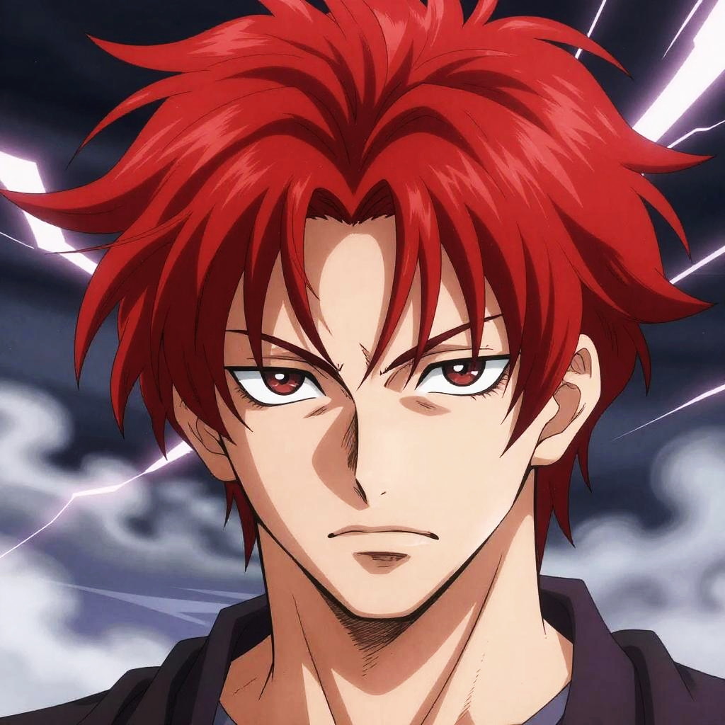 Digital anime-style drawing of a young man with striking red, spiky hair and intense red eyes. He has a pale complexion and a serious expression, with slightly furrowed brows. He wears a dark-colored shirt. The background features a dark, cloudy sky with bright, white lightning bolts cutting through, adding a dramatic effect. The overall style is typical of Japanese anime, with sharp lines and vibrant colors. The image focuses on the upper body and head of the character.