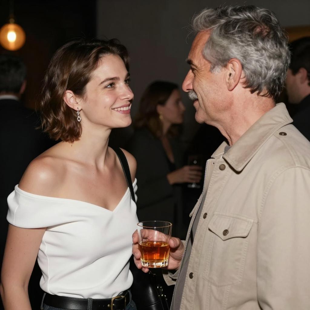 A man and woman at a nighttime indoor event. The woman, with short red hair, wears a gold sequined jacket and necklace, smiling at the man. The man, with grey hair, wears a black tuxedo, holding a glass, smiling back. A large plant and city lights in the background. Two people partially visible on the right.