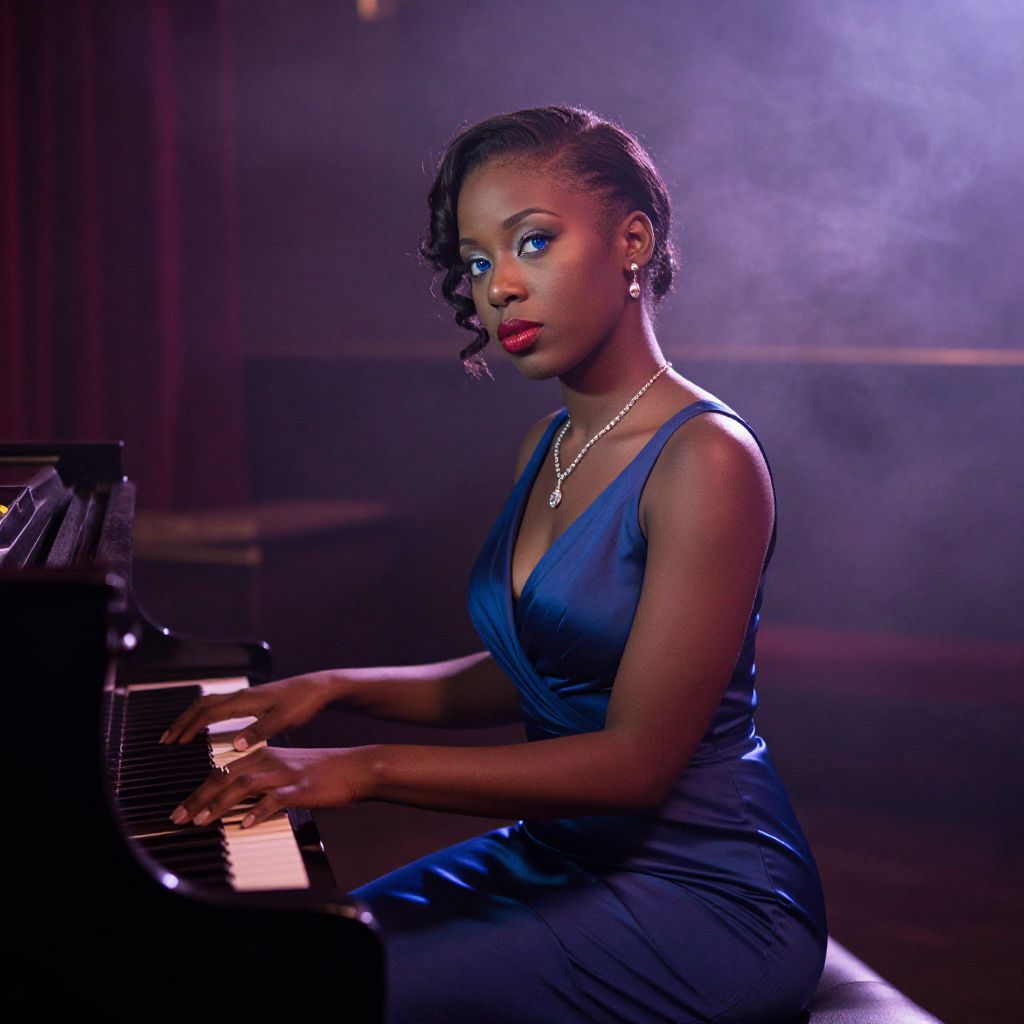 Blue eyed black woman seated at a grand piano in a dimly lit jazz club, vintage ambiance, soft smoky haze around her, elegant evening gown, soulful expression, rich deep blues and purples in color palette, cinematic lighting