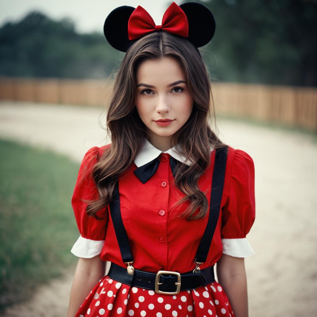 Portrait of a young woman wearing a Minnie Mouse inspired costume featuring black mouse ears with a red bow, a red shirt with black suspenders, a white collar, and a red polka dot skirt. She has long brown hair and is standing outdoors with a blurred natural background.