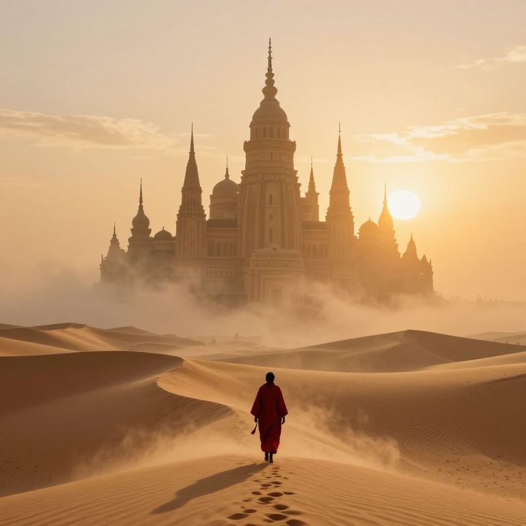 Majestic sand dunes stretch beneath a golden sky as a solitary figure in a crimson robe walks toward an ancient, towering city shrouded in swirling clouds and dust, its spires piercing the horizon under the warm glow of the setting sun.
