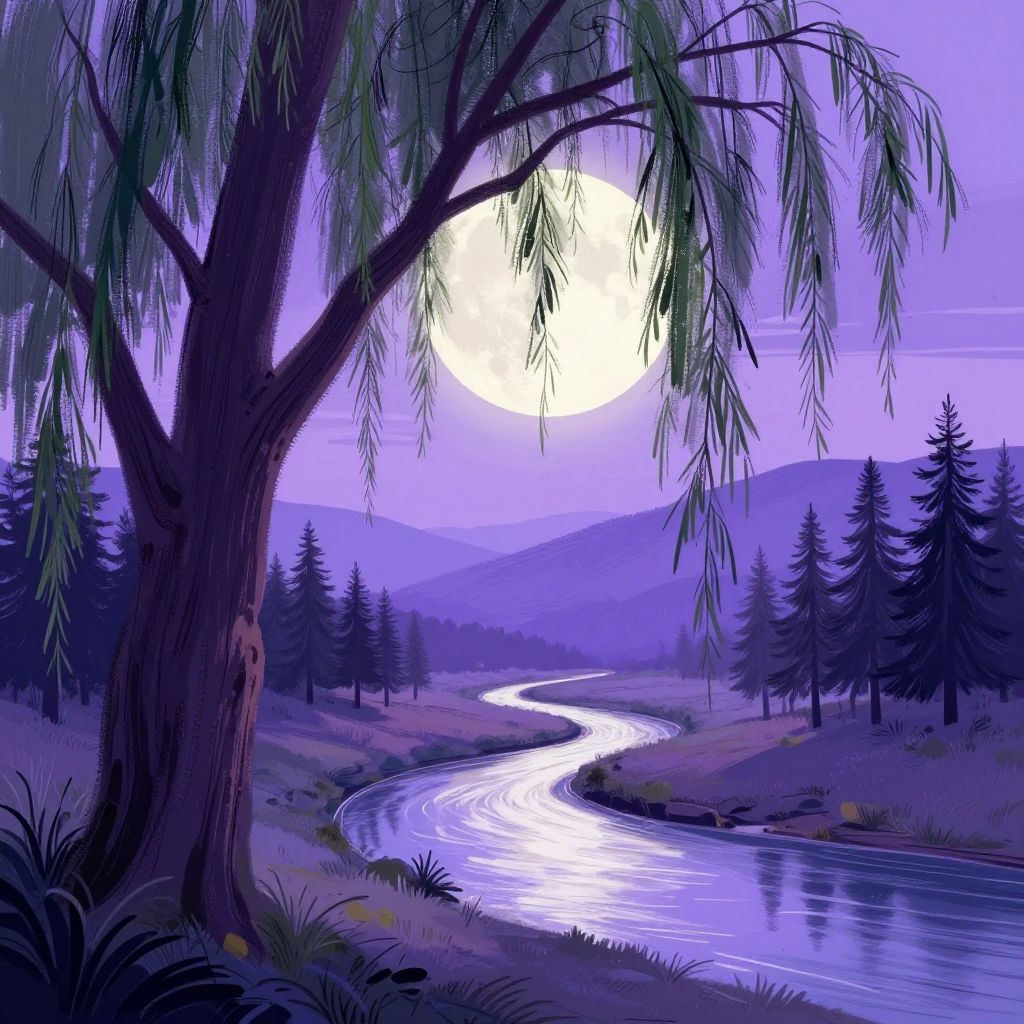 This digital artwork features a serene, purple-hued nighttime landscape. A large, textured tree with drooping, leafy branches occupies the left foreground, its dark brown trunk standing out against the soft, lavender sky. A glowing, full moon, positioned slightly right of center, casts a bright, white light over the scene. A winding river, reflecting the moonlight, snakes through the middle ground, bordered by tall, dark pine trees. The background includes rolling, shadowy hills, enhancing the tranquil atmosphere. The overall color palette is dominated by shades of purple and blue, creating a calm, dreamy effect.